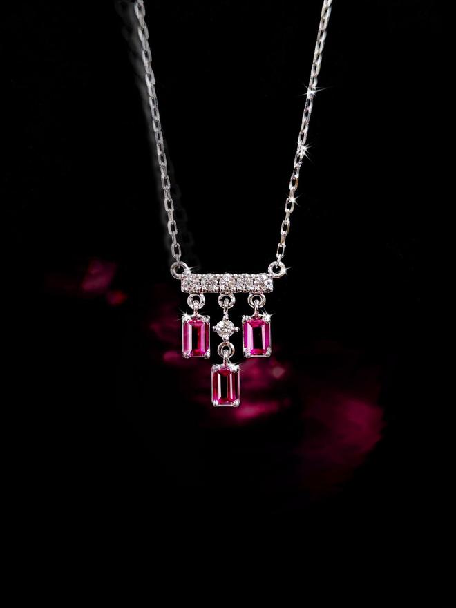 日本轻奢珠宝品牌AHKAH也推出了一条chandelier sway petit红宝石特别款项链,以水晶吊灯为灵感打造。该项链吊坠粉红色的光泽来自长方形切割的红宝石,而闪亮的光芒来自密集镶嵌的圆形明亮式切割钻石。